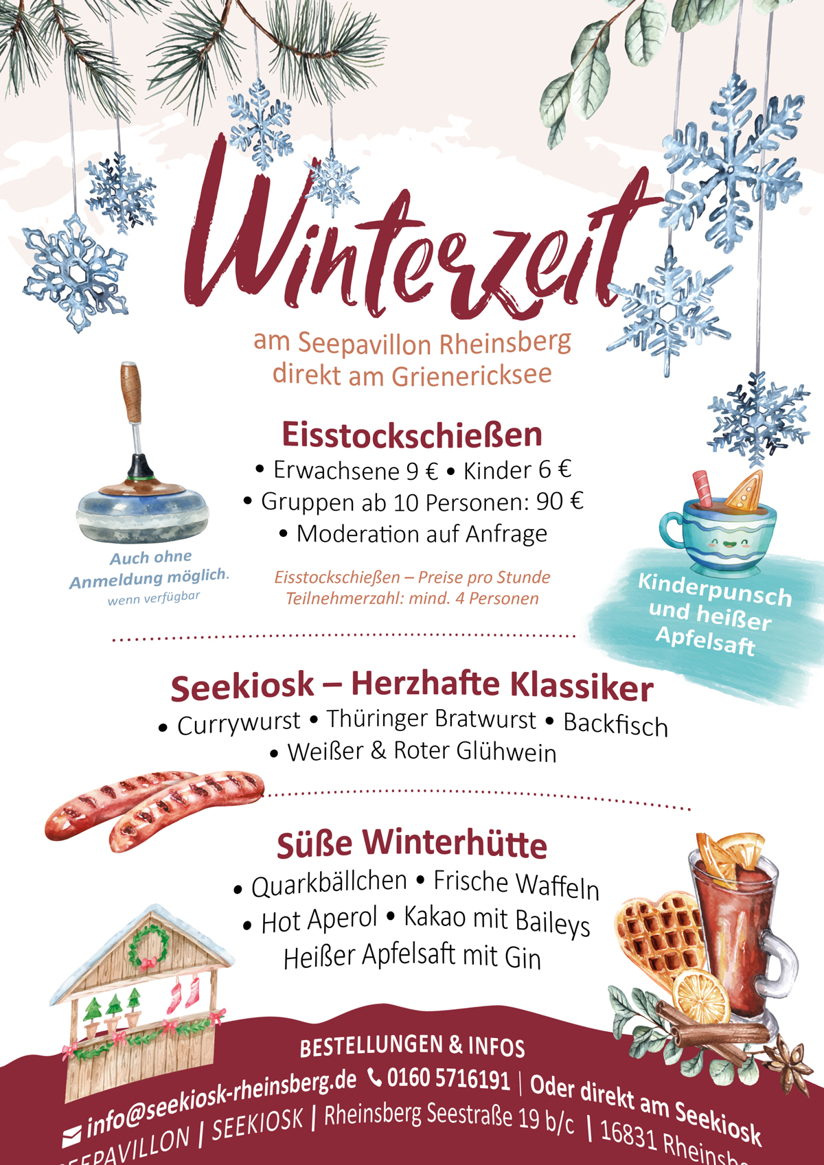 Hinter dem Kiosk ist ein kleiner Biergarten mit Seeblick, wo Sie sich hinsetzen können, falls Sie Ihre Sachen nicht „to go“ möchten, sondern gemütlich im Sitzen essen. Das Angebot umfasst herzhafte Imbissklassiker wie Pommes, Bratwurst, Backfisch mit selbstgemachter Remoulade etc, sowie Eis, erfrischende Kalt- und wärmende Heißgetränke.